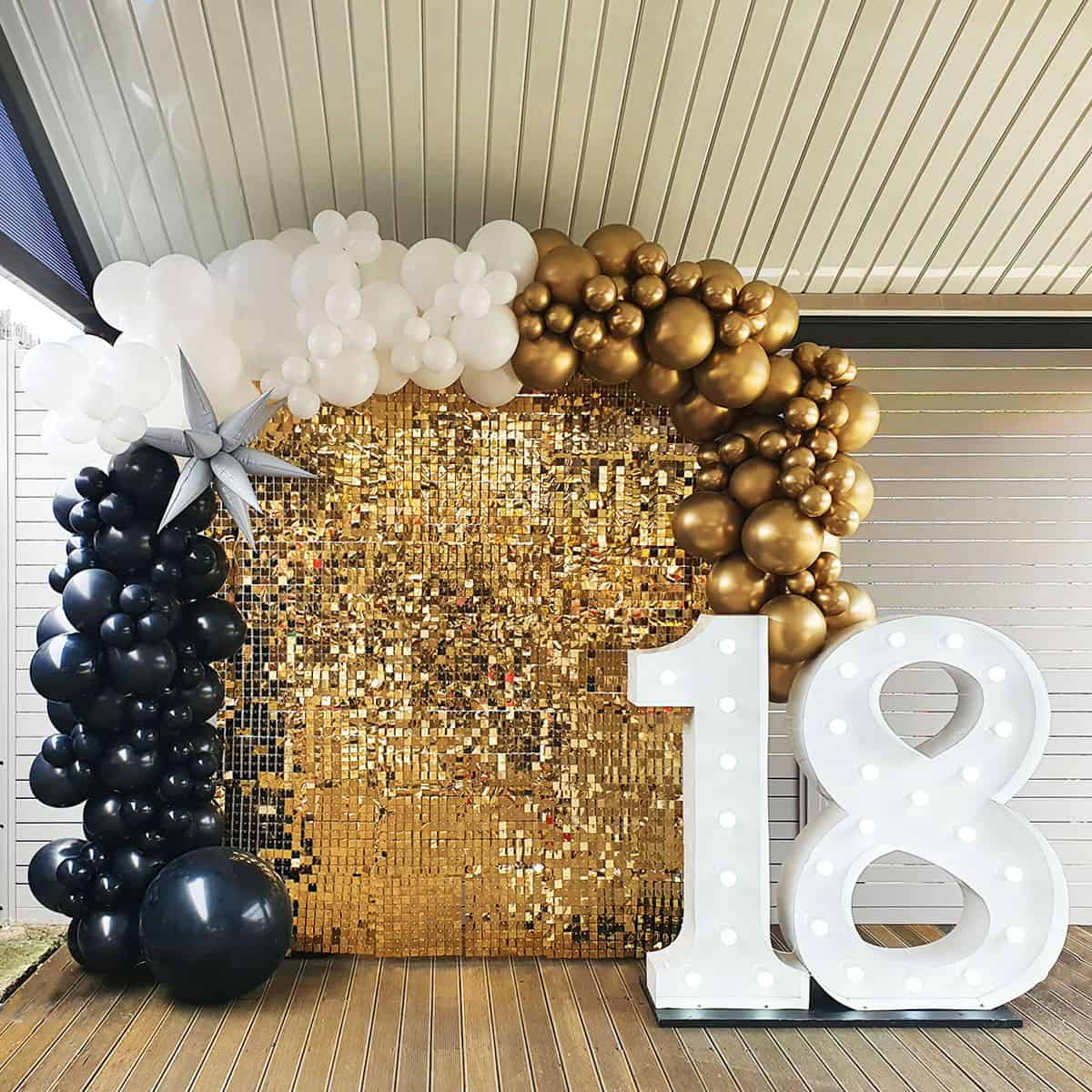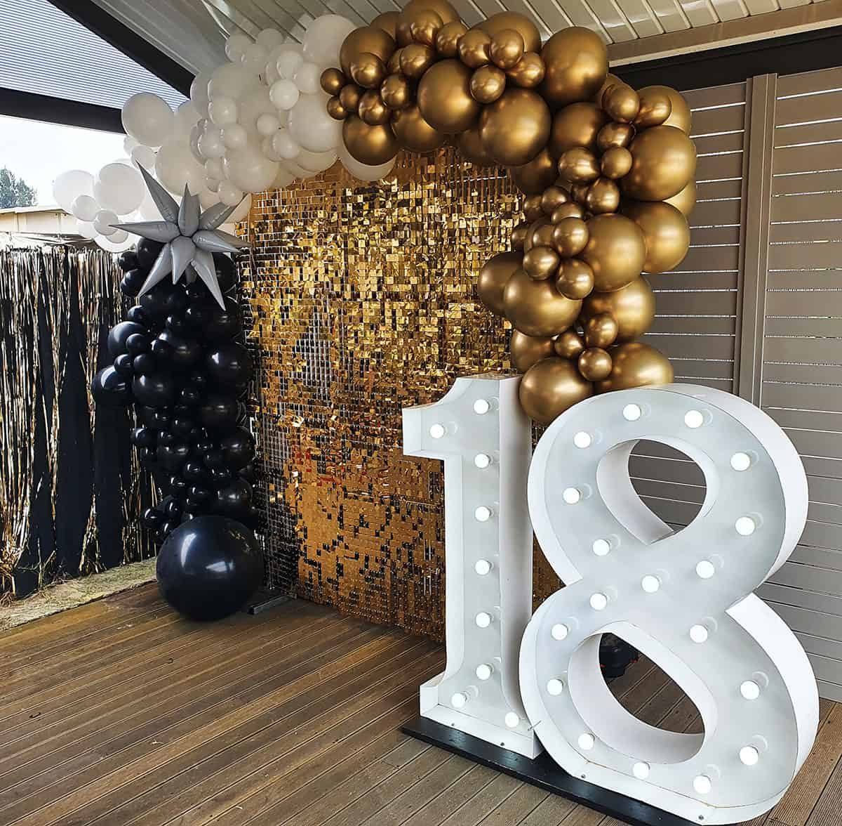 The perfect photo backdrop for your party guests! The Deluxe Package includes a Shimmer Wall in your choice of Gold, Rose Gold or Silver, with 4m balloon garland and two light up numbers, letters, or symbols (#,&).
