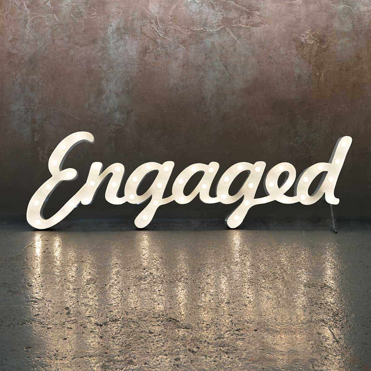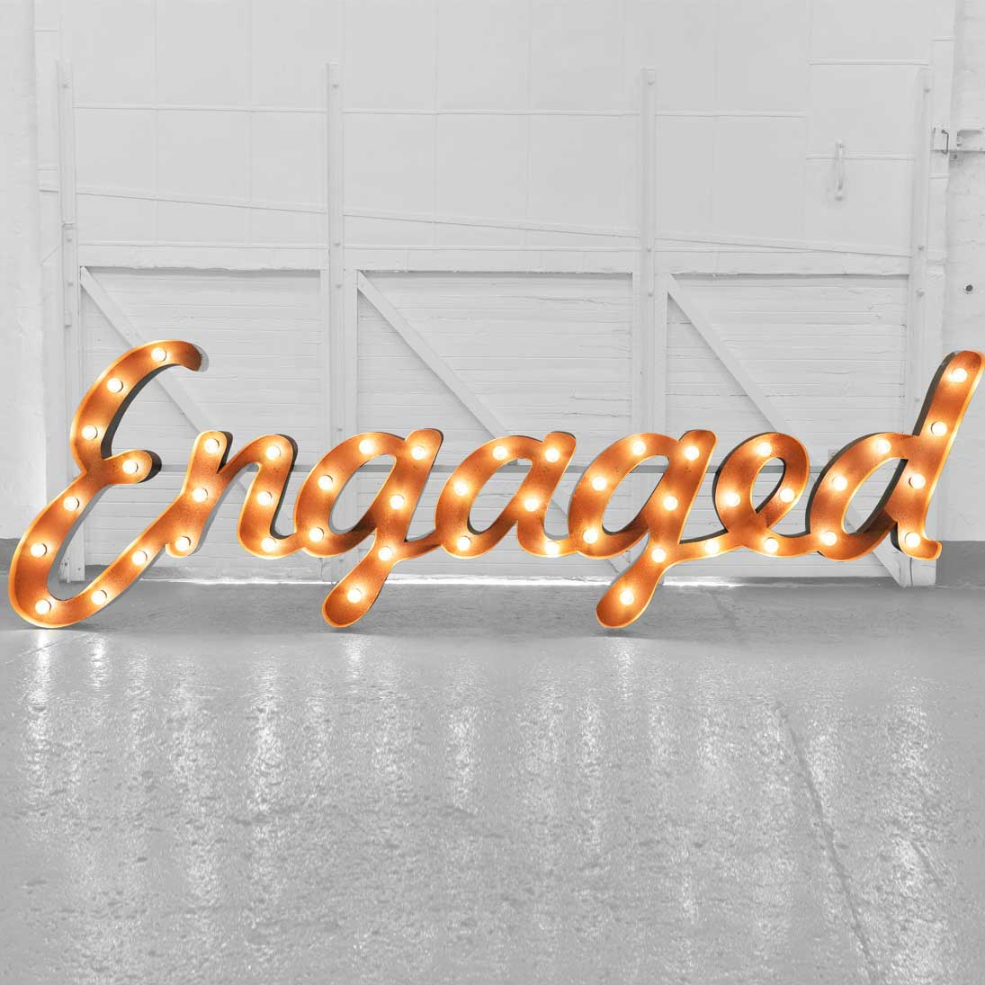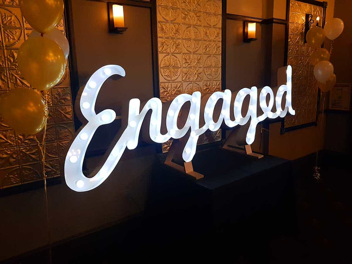 This 0.9m high ‘Engaged’ centrepiece in gleaming russet metal is a must-have for your engagement party photos.